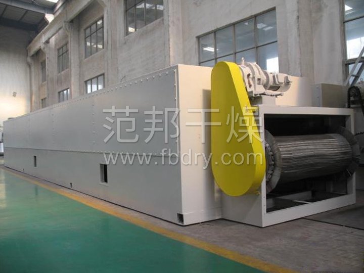 整個生產線為全封閉型(對物料而言),由擺動布料段、干燥段、出料段三部分組成。擺動布料段作用使海藻均勻分散在網板上,并且勻速輸送到干燥段,海藻經過80℃熱風干燥段,90℃熱風干燥段和120℃熱風干燥段后,再經過出料段排料。循環風向及各單元內風的循環為向下式,即加熱后的空氣由引風機吸入,在風機出風口首先預分布再經過孔板均風后,熱風從物料的下面向上(或從物料的上面向下)穿透物料層。